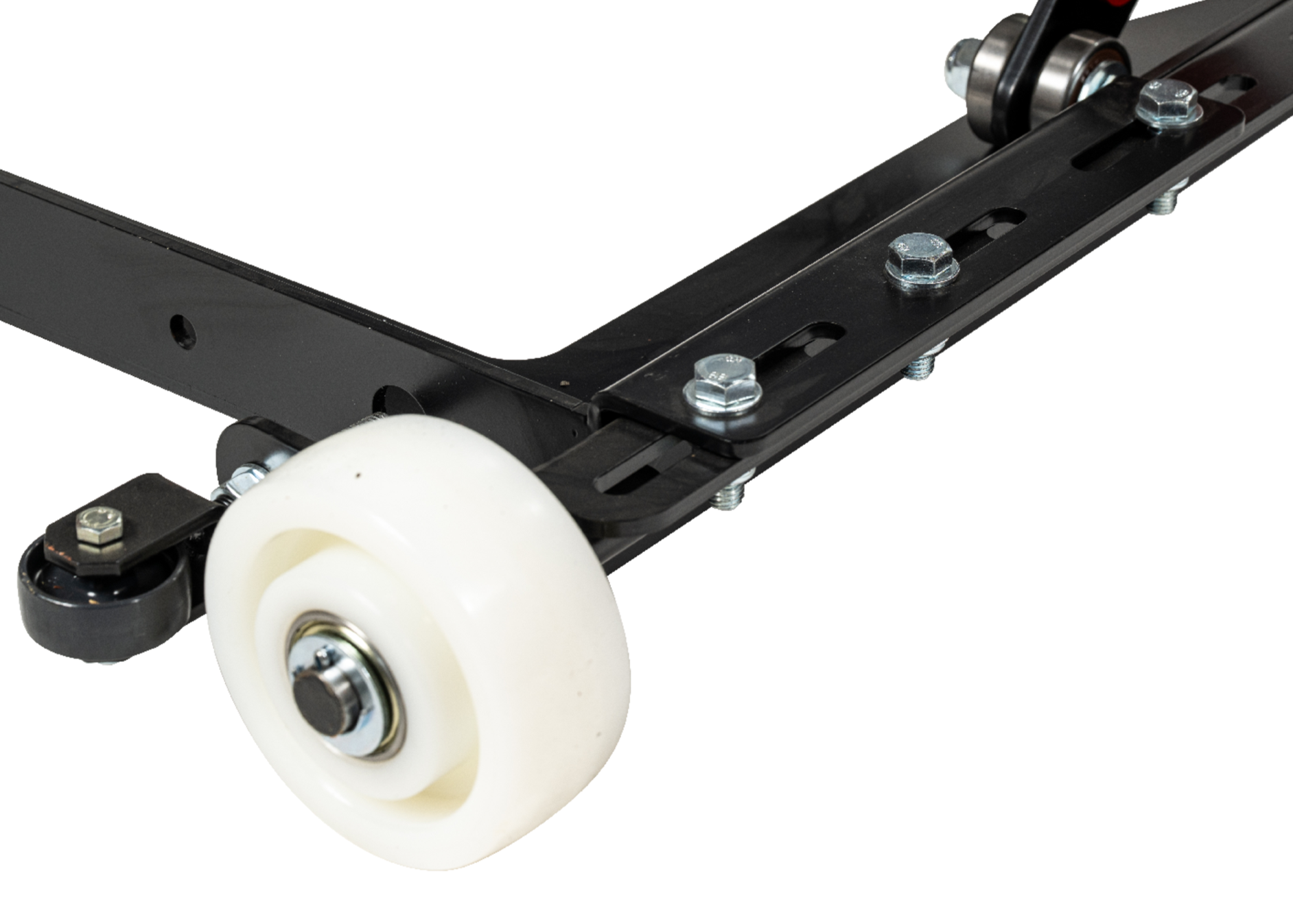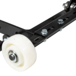 Effektiv luftmanövrerad broms på två hjul med återfjädrande manöverspak för att plattformen aldrig ska stå obromsad.